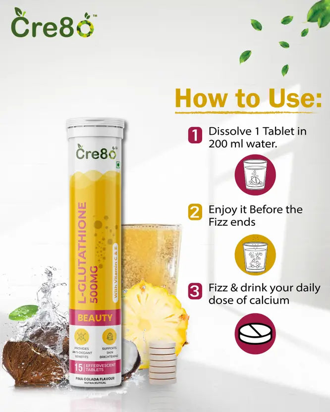 - Give your body the antioxidant boost it deserves with Glutathione 500mg Effervescent Tablets. Designed for fast absorption and great taste, these easy-to-take tablets dissolve in water to support healthy skin, immunity, and natural detoxification. Brighten & Even Skin Tone – Supports skin radiance and reduces dark spots from the inside out. Powerful Antioxidant – Fights free radicals, reduces oxidative stress, and supports overall wellness. Clean, Sugar-Free Formula – Vegan-friendly, non-GMO, and free from gluten, sugar, and artificial additives. Effervescent Delivery – Simply drop in water for a refreshing, tropical-flavored drink with better absorption than capsules.