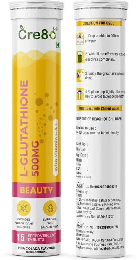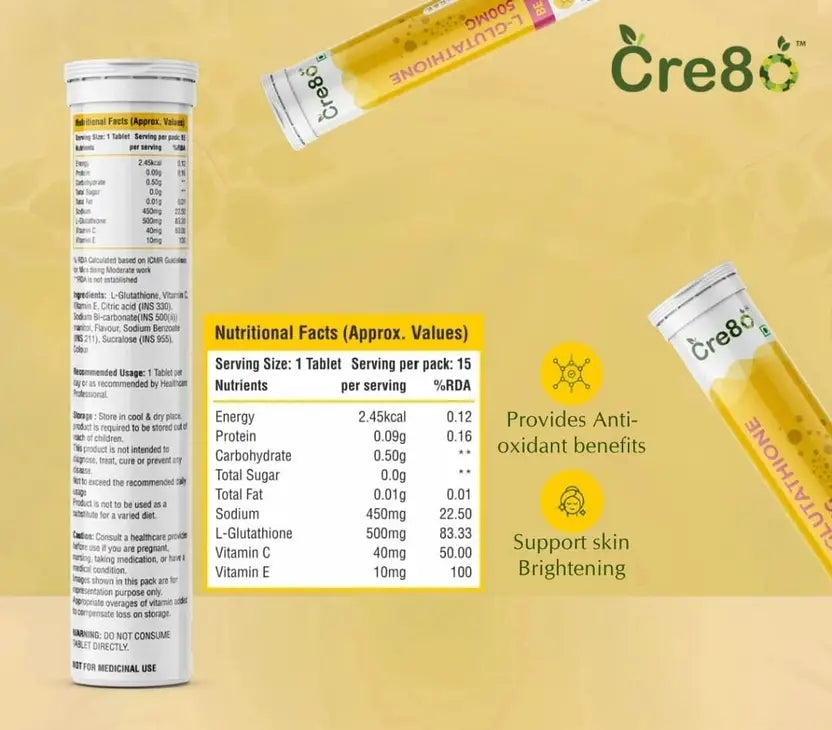 - 𝗦𝗔𝗙𝗘, 𝗘𝗙𝗙𝗘𝗖𝗧𝗜𝗩𝗘 & 𝗧𝗥𝗨𝗦𝗧𝗘𝗗 𝗤𝗨𝗔𝗟𝗜𝗧𝗬 Cre8o Glutathione Skin Glow Tablets are crafted with 99% pure glutathione and manufactured in GMP-certified facilities. They are FSSAI approved, non-GMO, and free from added sugar. Each tablet undergoes over 230 rigorous quality checks to ensure it is completely free from heavy metals, toxins, and harmful contaminants. Safe for daily use, these clinically validated tablets deliver effective skin brightening and rejuvenation, helping you achieve a healthy, radiant glow—safely and reliabl
