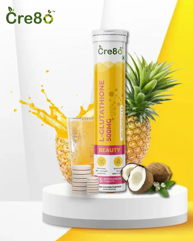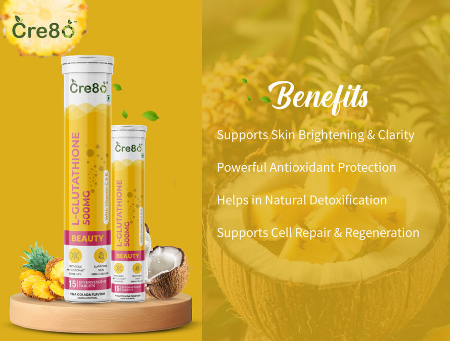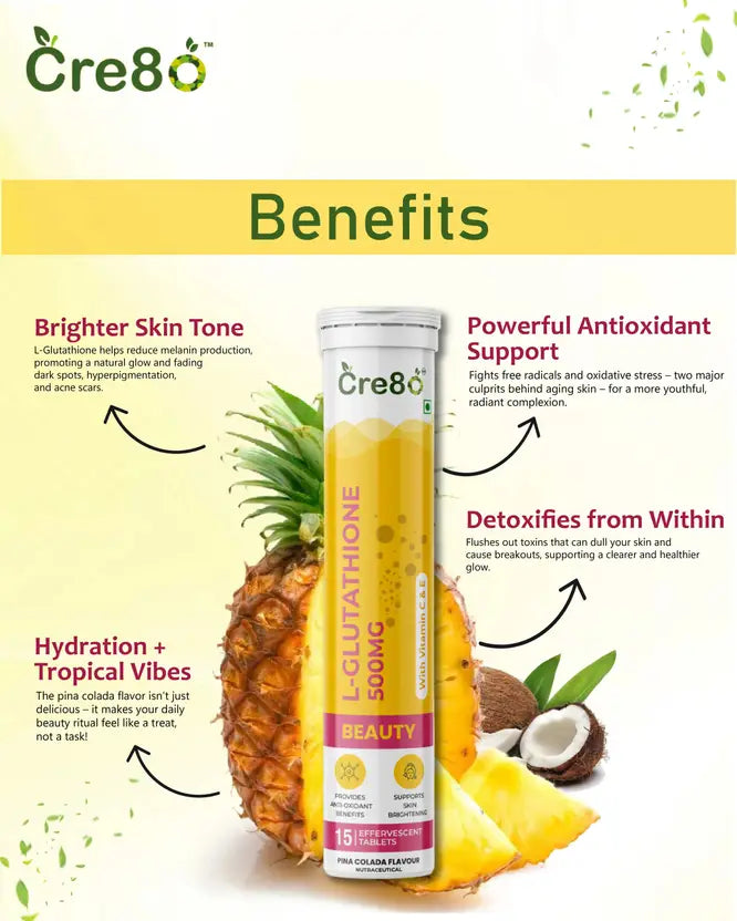 - 𝗧𝗛𝗘 𝗦𝗖𝗜𝗘𝗡𝗖𝗘 𝗕𝗘𝗛𝗜𝗡𝗗 CRE8O 𝗚𝗟𝗨𝗧𝗔𝗧𝗛𝗜𝗢𝗡𝗘 𝗘𝗙𝗙𝗘𝗥𝗩𝗘𝗦𝗖𝗘𝗡𝗧 𝗧𝗔𝗕𝗟𝗘𝗧𝗦 CRE8O Glutathione Tablets are backed by science to deliver visible skin benefits. Glutathione, known as the body’s master antioxidant, has been shown to reduce melanin production by up to 225% within 4 weeks, helping to brighten and even out skin tone. Vitamin C enhances glutathione absorption, while L-Cysteine supports your body’s natural glutathione production. significantly improve skin radiance and reduce pigmentation in just 8 weeks. Powered by advanced research, our formula promotes healthier, glowing skin from within.
